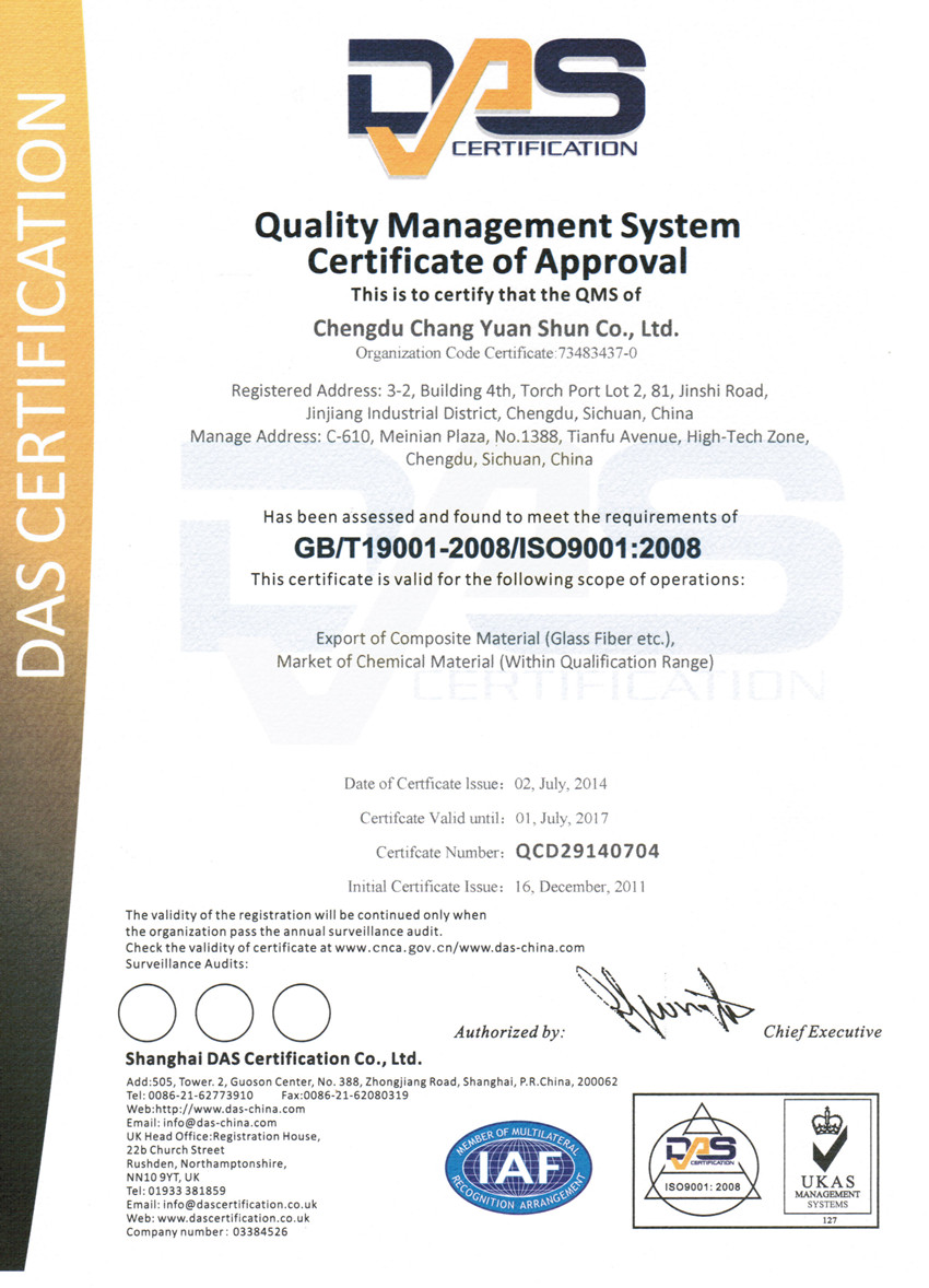 CYS® always consider the quality is the most important, All of our products are produced according to standard GB/T1549-1994 GB/T18371-2001, GB/T18372-2001, GB/T18369-2001, GB/T4202-2001, and ISO9001-2008 quality controlled. Our quality already been proved by our clients from more than 30 countries, some of our clients are very famous and reputated glass fiber producers, we OEM for them with their brands also earned very good feedbacks .