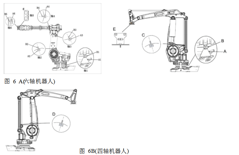 IRB 120 機器人本體的6個軸均有零點標記,如下圖所示。手動將機器人各軸零點標記對準,記錄當前轉數計數器數據,控制器內部將自動計算出該軸的零點位置,并以此作為各軸的基準進行控制。